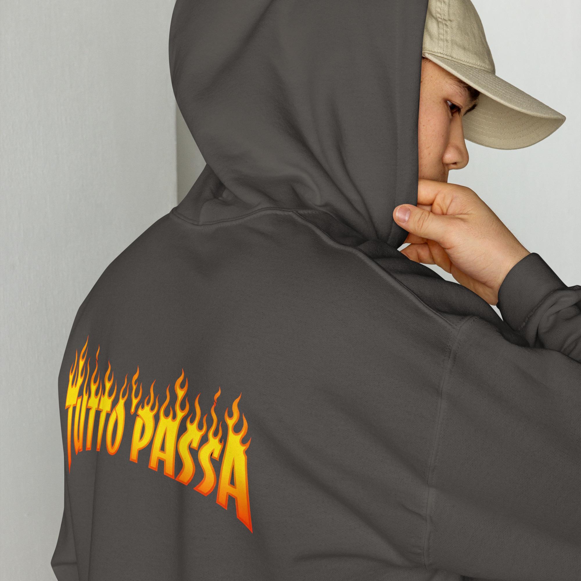 Bold, minimalist hoodie featuring the phrase “TUTTO PASSA” in a striking flame-style typography. Inspired by resilience, attitude, and street culture, this design blends meaning with modern edge. A statement piece that works for everyday wear or as a unique gift with personality.