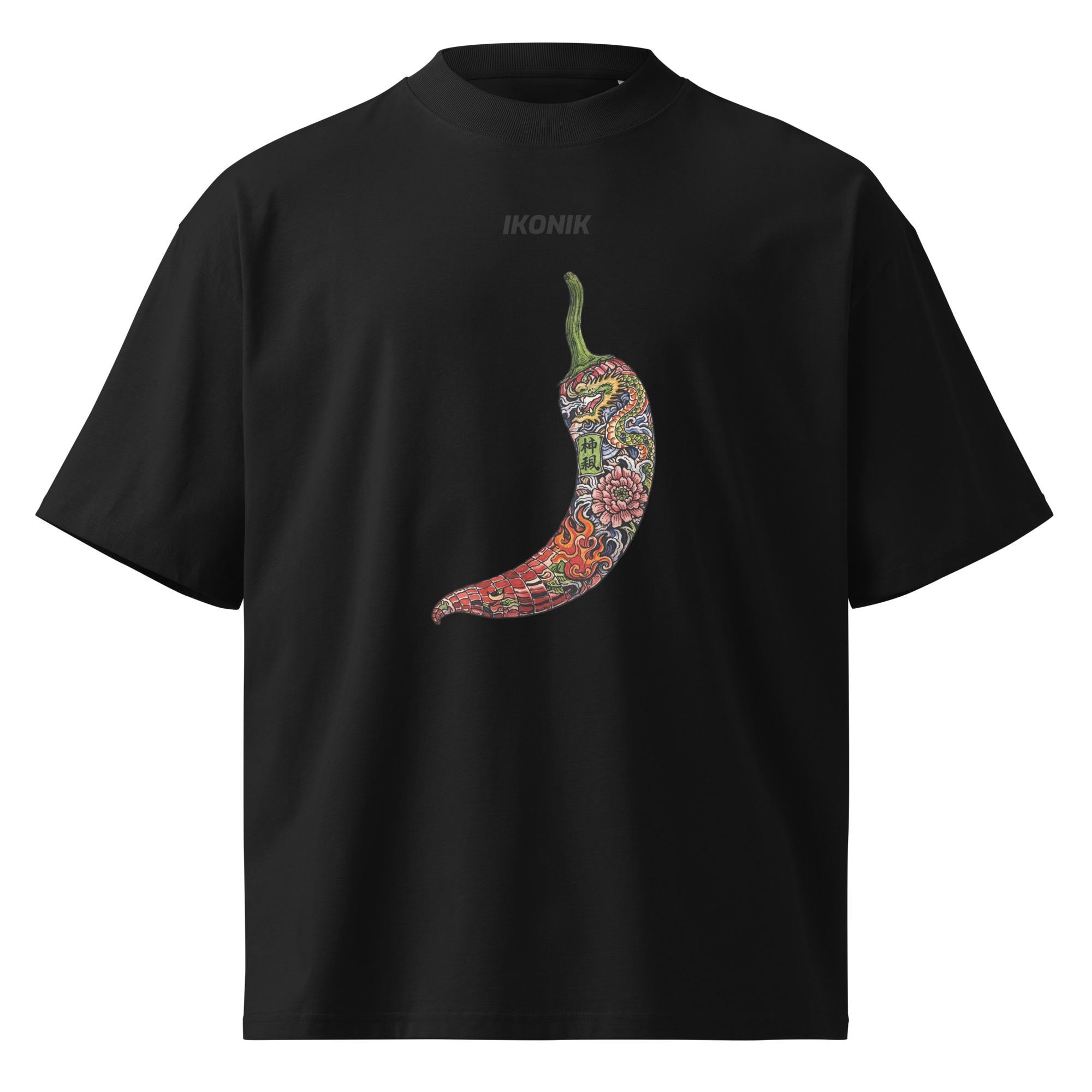 Make a bold statement with this oversized high-neck T-shirt featuring a fiery chili pepper filled with Chinese dragon and floral tattoo-style art. Symbolizing power, passion, and intensity, this design blends Asian mythology with modern streetwear aesthetics.