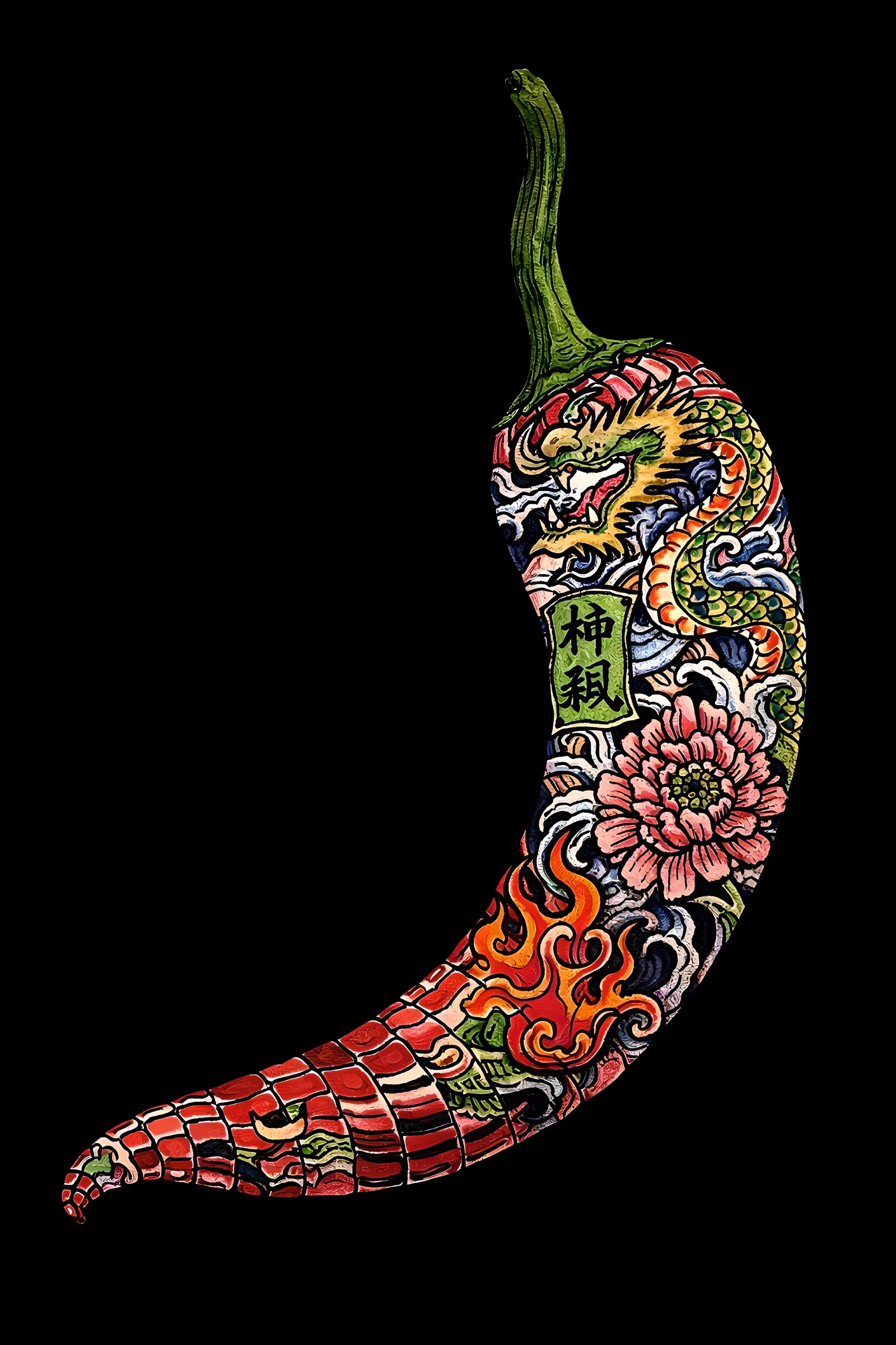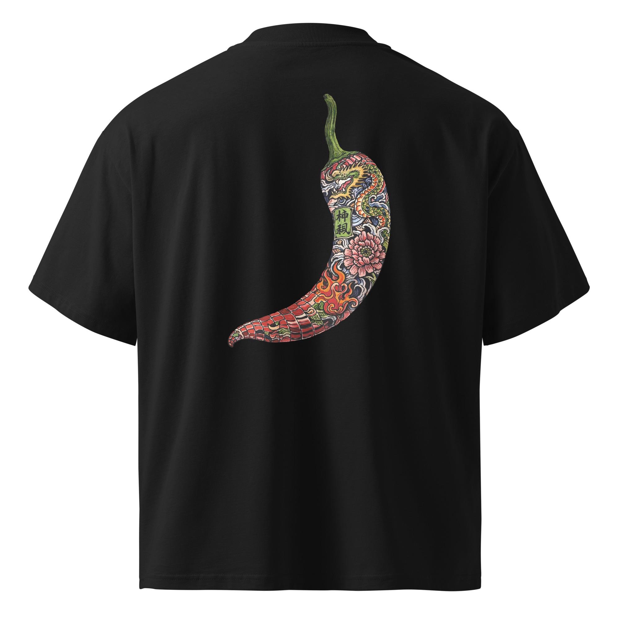 Make a bold statement with this oversized high-neck T-shirt featuring a fiery chili pepper filled with Chinese dragon and floral tattoo-style art. Symbolizing power, passion, and intensity, this design blends Asian mythology with modern streetwear aesthetics.