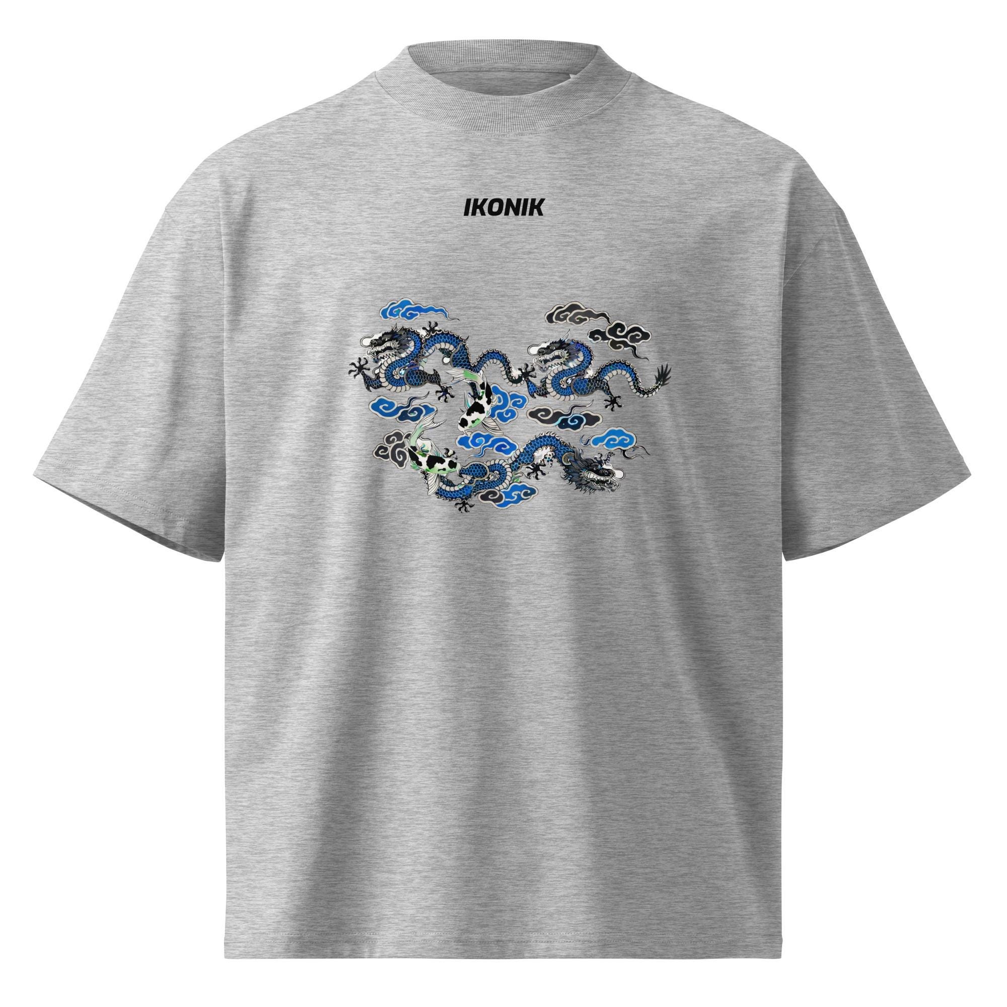 Make a statement with this oversized high-neck T-shirt featuring an intricate dragon and koi fish composition, inspired by Asian mythology and symbolism. Dragons represent power and wisdom, while koi fish symbolize perseverance and balance—together creating a dynamic, meaningful design with a strong streetwear presence.