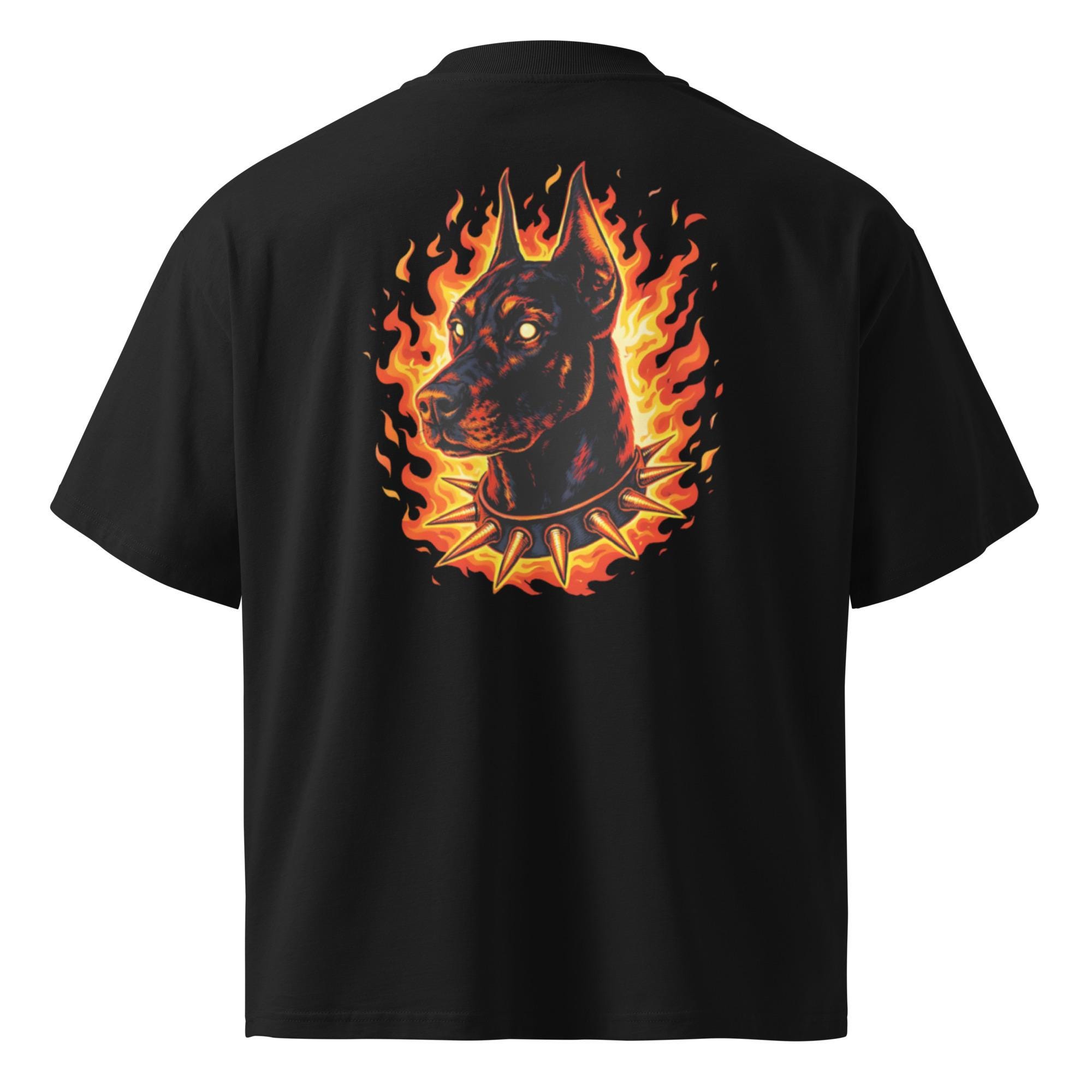 Unleash bold energy with this oversized high-neck T-shirt featuring a fierce Doberman surrounded by flames and a spiked collar. Powerful, dark, and unapologetic, this design blends aggressive animal symbolism with fiery streetwear aesthetics—perfect for statement looks and edgy everyday wear.