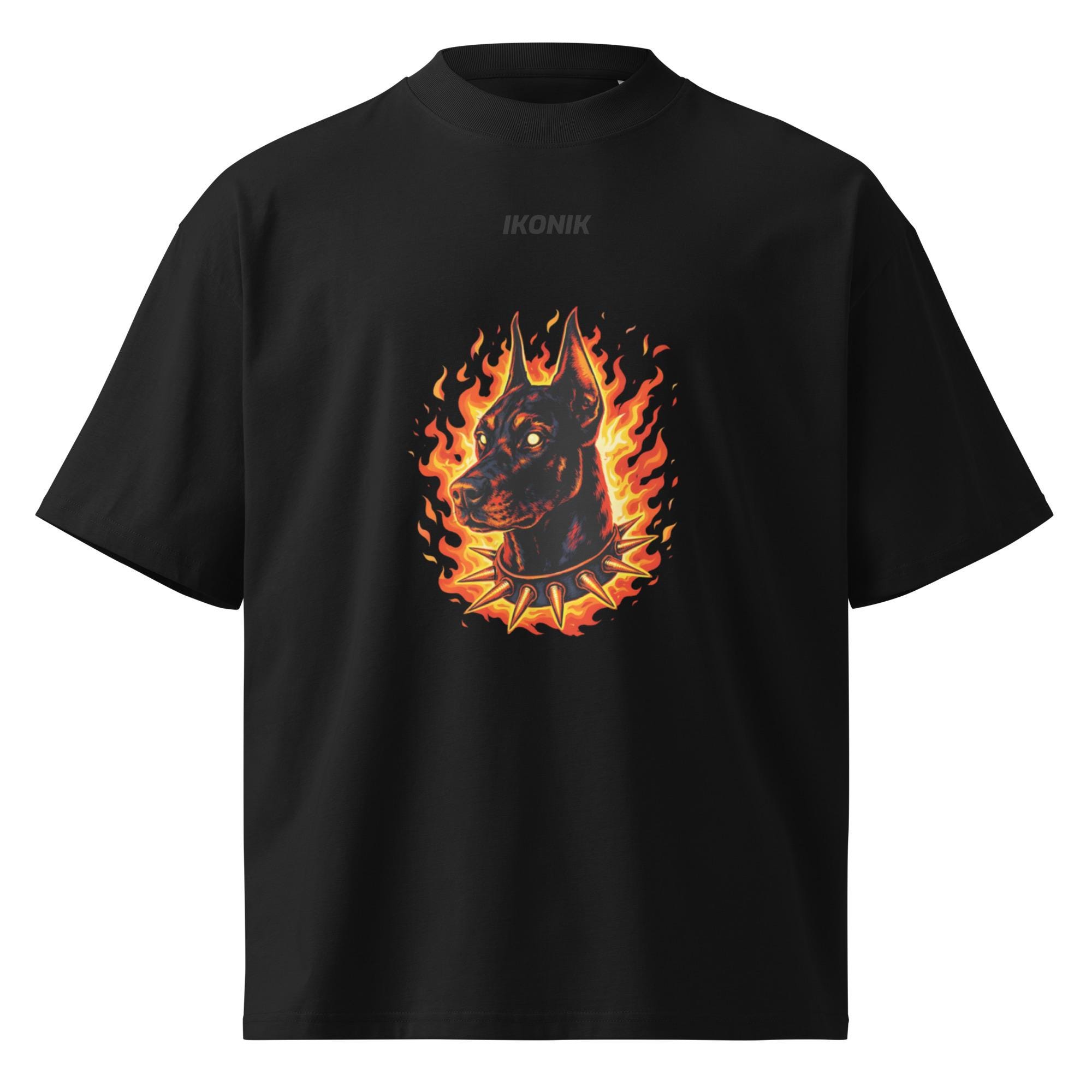 Unleash bold energy with this oversized high-neck T-shirt featuring a fierce Doberman surrounded by flames and a spiked collar. Powerful, dark, and unapologetic, this design blends aggressive animal symbolism with fiery streetwear aesthetics—perfect for statement looks and edgy everyday wear.
