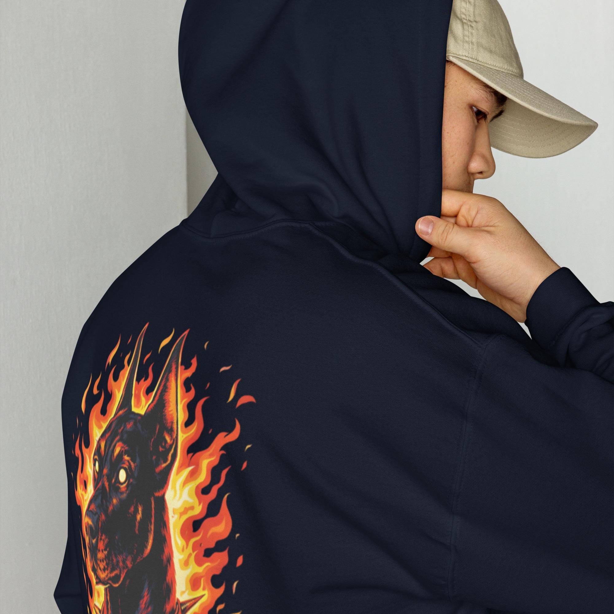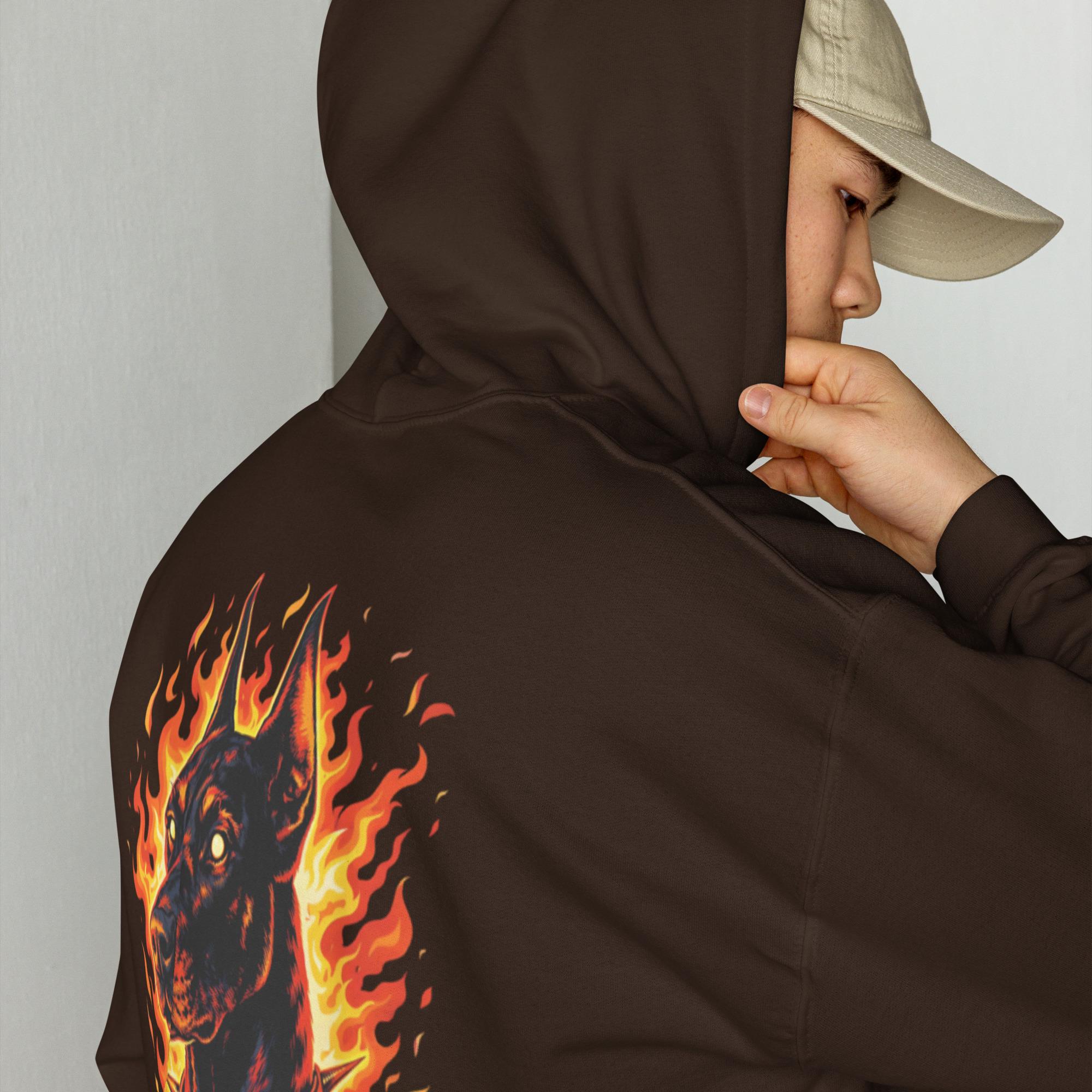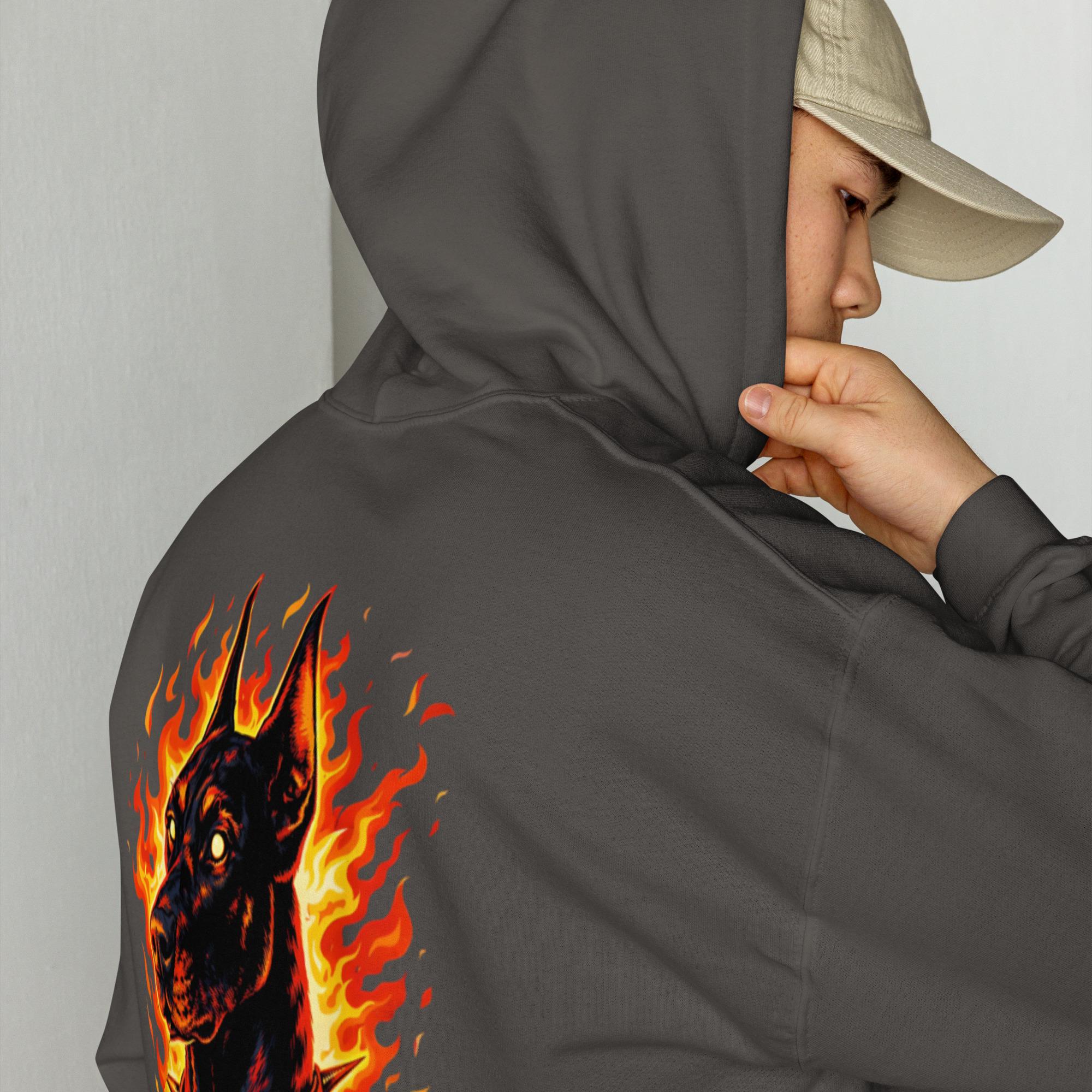 Make a powerful statement with this Flaming Doberman hoodie, showcasing a fierce dog portrait surrounded by blazing flames and a spiked collar. Designed for bold personalities, this hoodie blends aggressive energy with striking streetwear aesthetics.