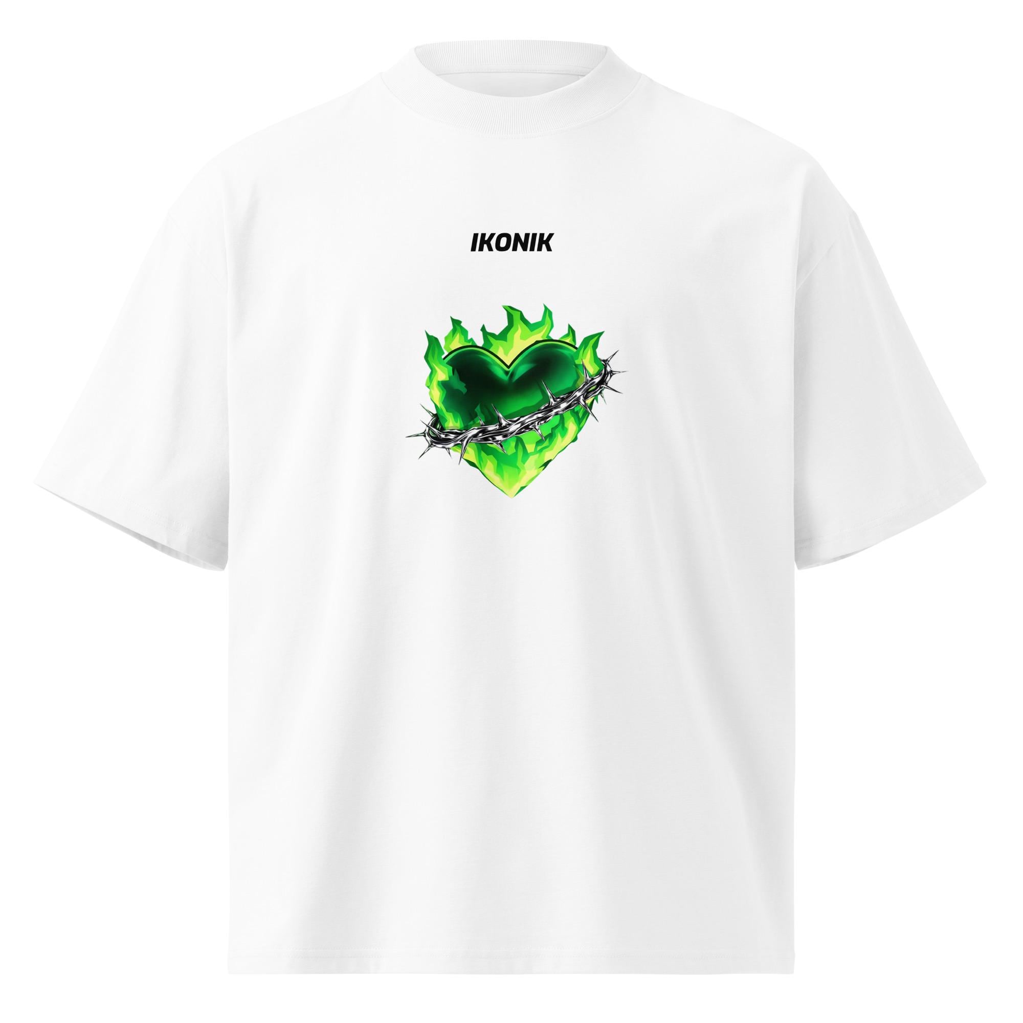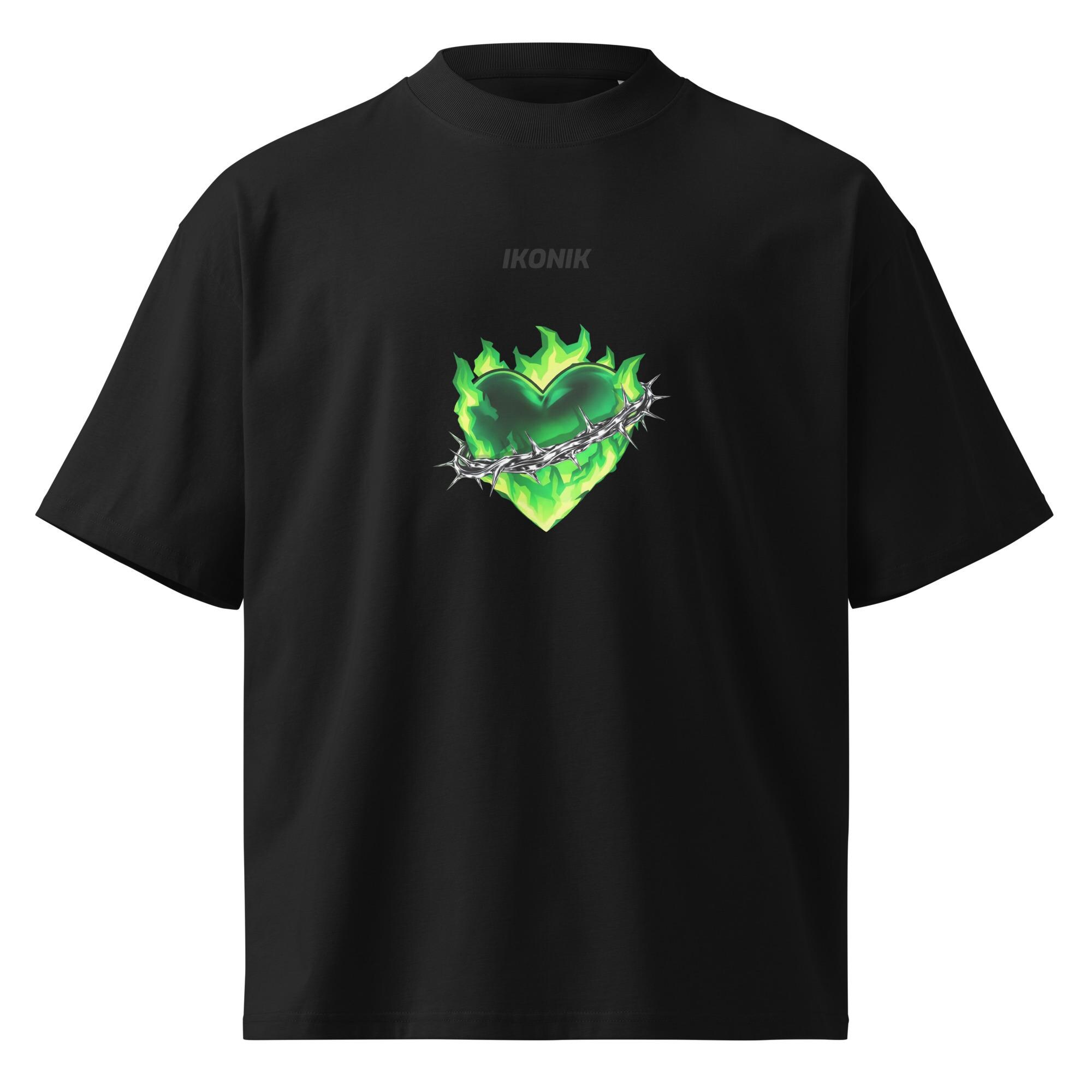 This oversized high-neck T-shirt features a glowing emerald green heart wrapped in sharp metallic thorns and surrounded by vivid flames, symbolizing passion, resilience, and intensity. The bold contrast between neon green fire and steel-like thorns creates a powerful dark-romance and streetwear aesthetic.