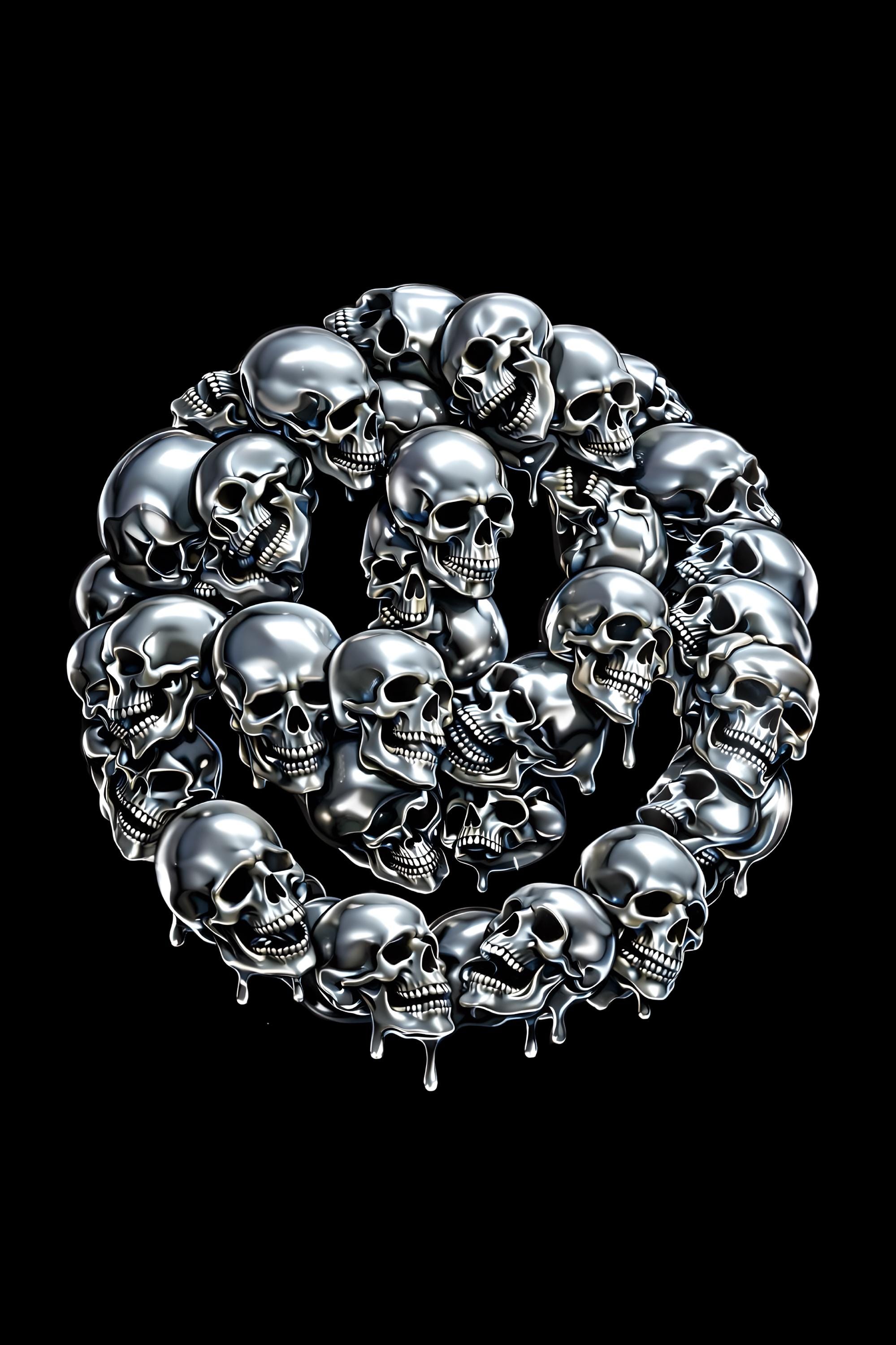 This T-shirt features a striking spiral of chrome-style skulls, forming a hypnotic circular design that blends gothic symbolism with a modern metallic aesthetic. Bold, dark, and visually intense, this graphic is perfect for fans of alternative fashion, skull art, and edgy streetwear.
