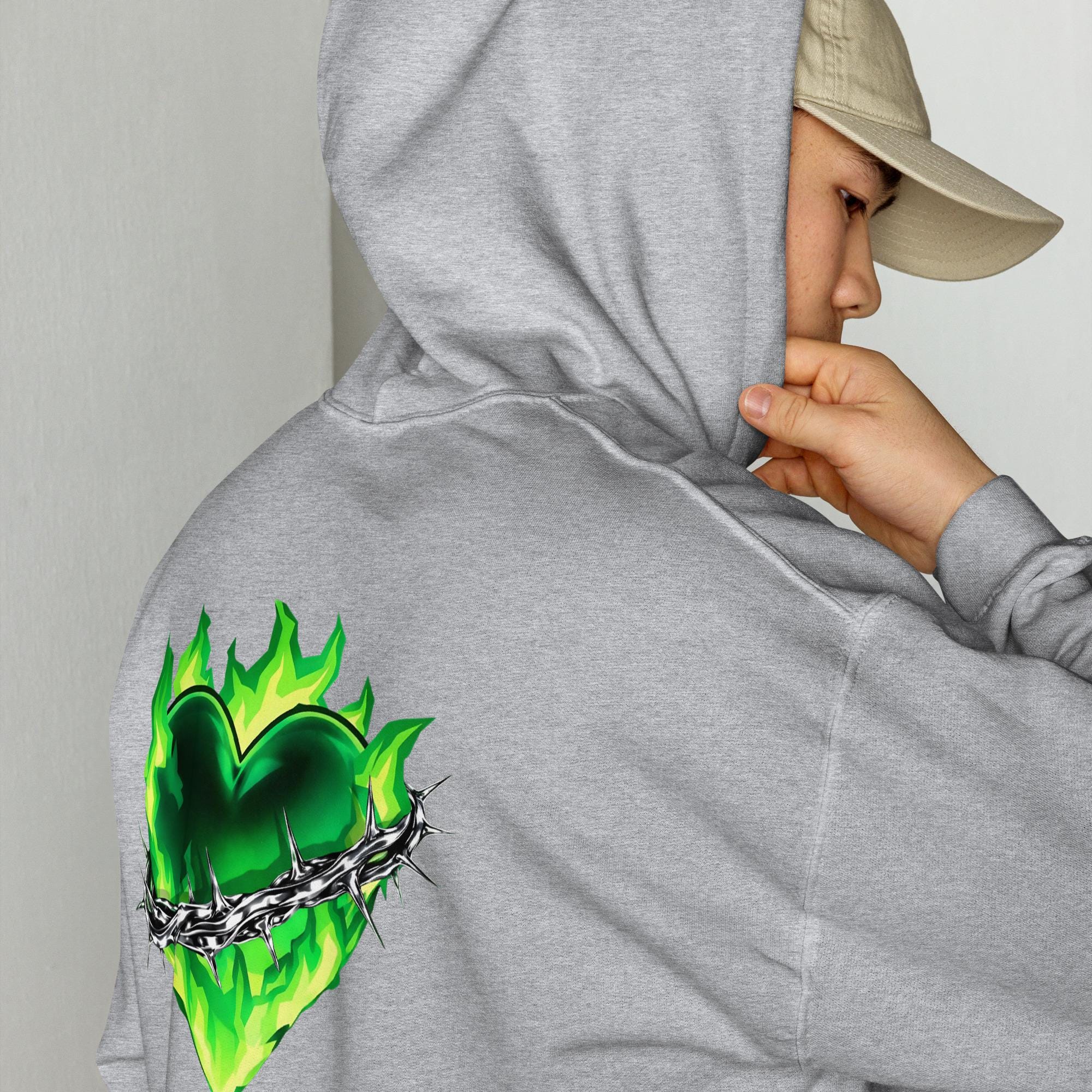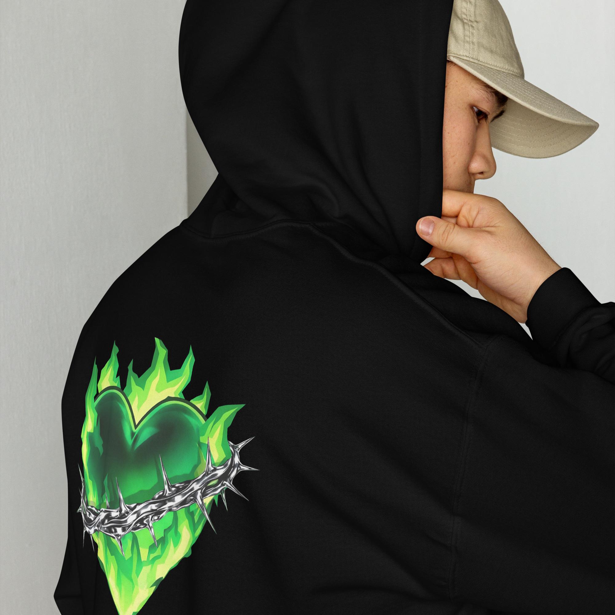 This cozy hoodie showcases a fiery emerald heart crossed by sharp metallic thorns, blending dark romance symbolism with a bold streetwear edge. The vivid green flames add intensity and movement, making this hoodie a standout piece for nightwear, urban outfits, and layered looks.