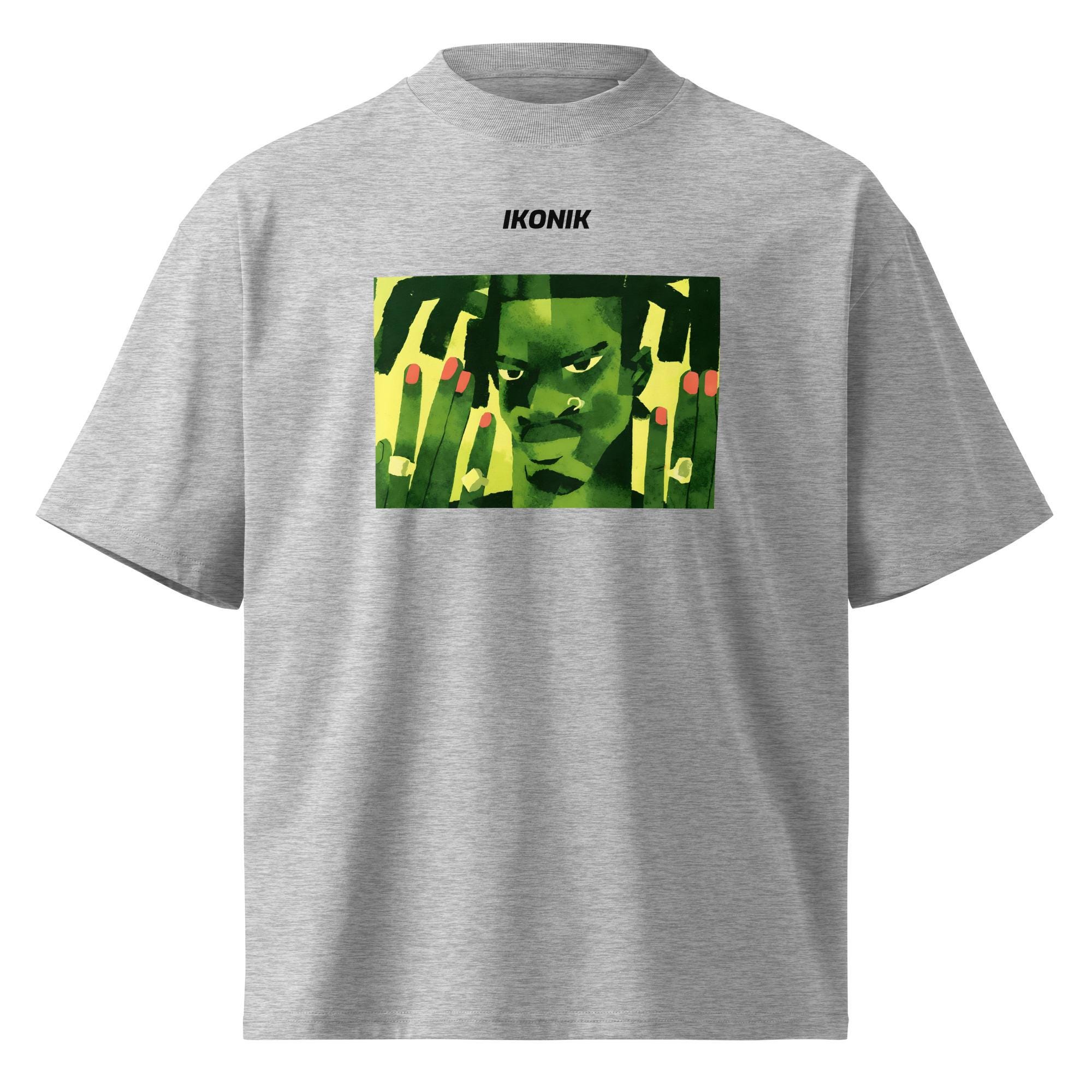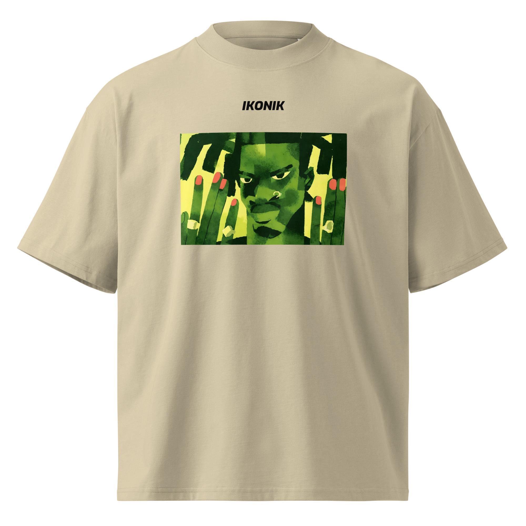 Bold abstract portrait t-shirt featuring a striking green-toned face with expressive hands and textured brushwork. Inspired by modern art and urban expression, this design blends emotion, attitude, and contemporary street aesthetics. Perfect as a statement piece for everyday wear.
