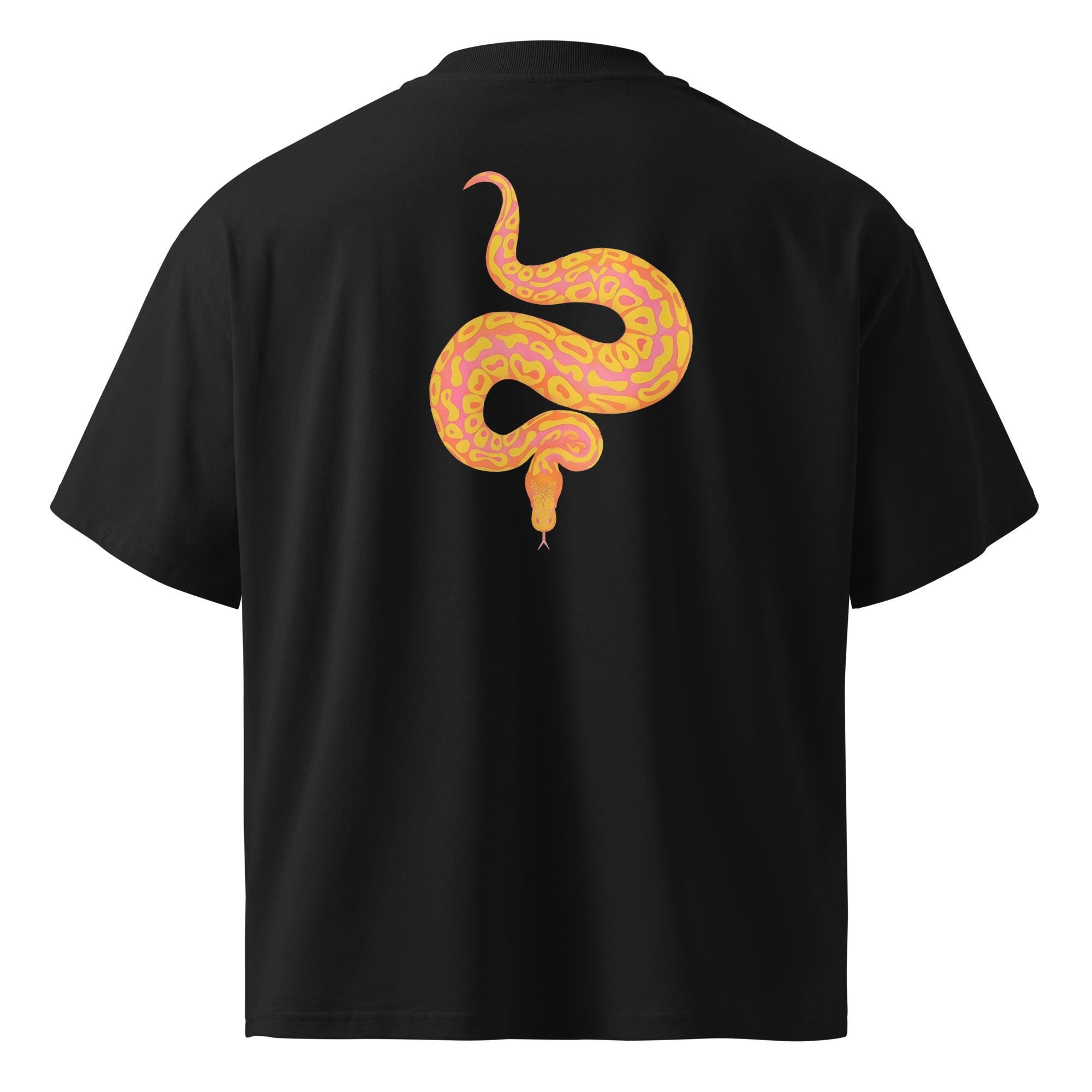 Bold and eye-catching snake t-shirt featuring a vivid orange and yellow python illustration with smooth curves and modern digital style. This design blends nature, color, and streetwear aesthetics, making it a standout piece for anyone who loves bold graphic fashion.