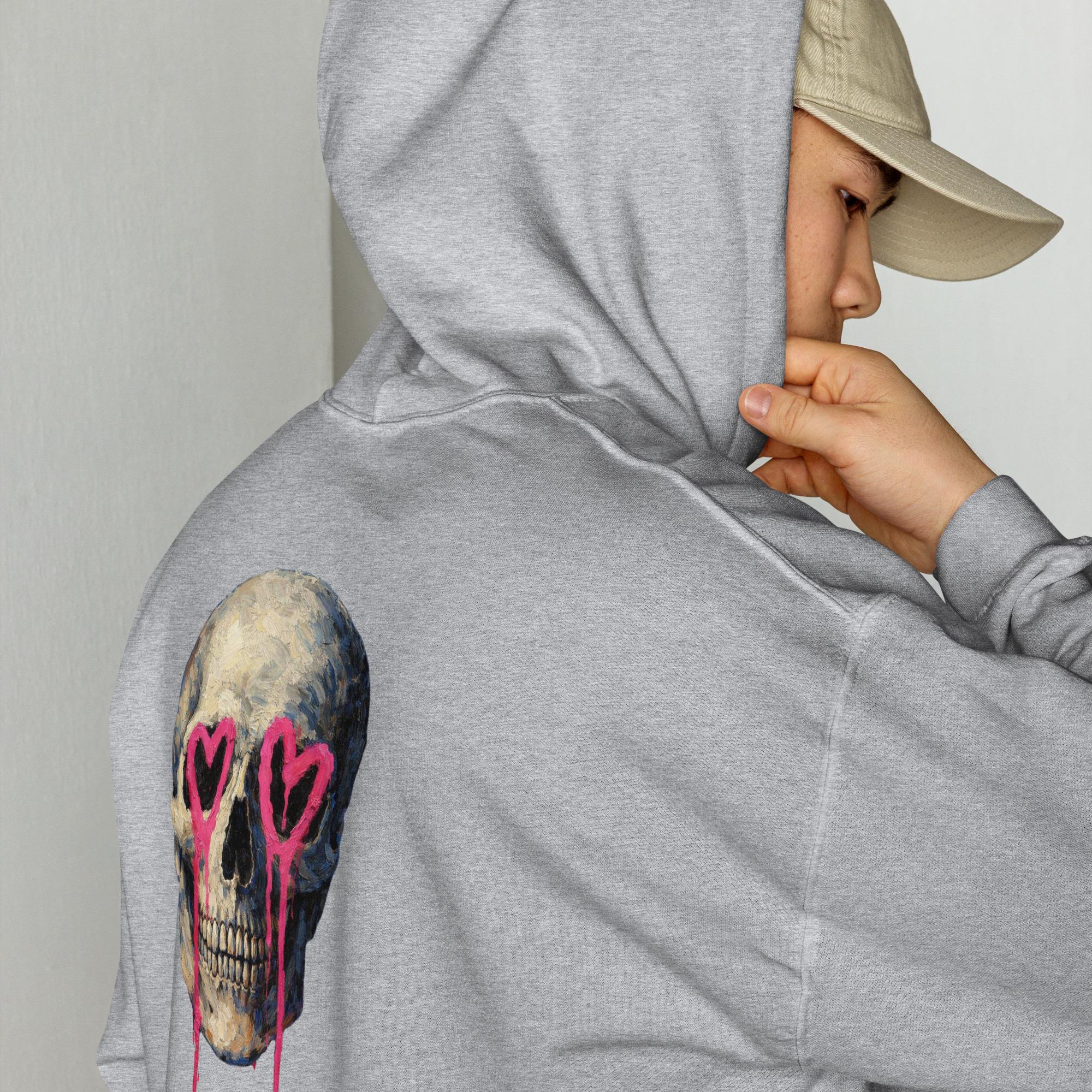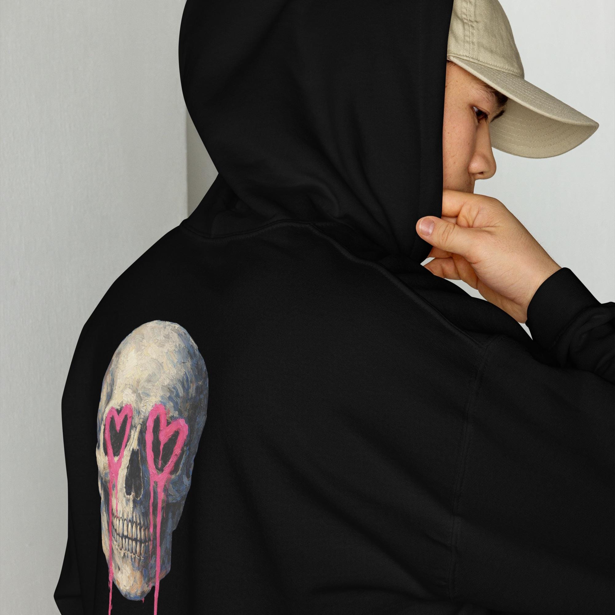 This bold skull hoodie blends raw edge with emotional symbolism. The dripping pink heart-shaped eyes represent vulnerability beneath a fearless exterior—combining street art attitude with modern expression.