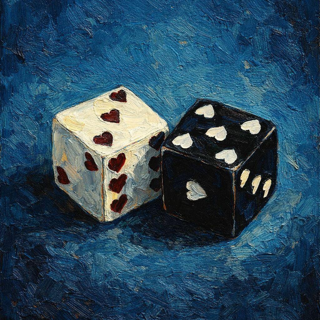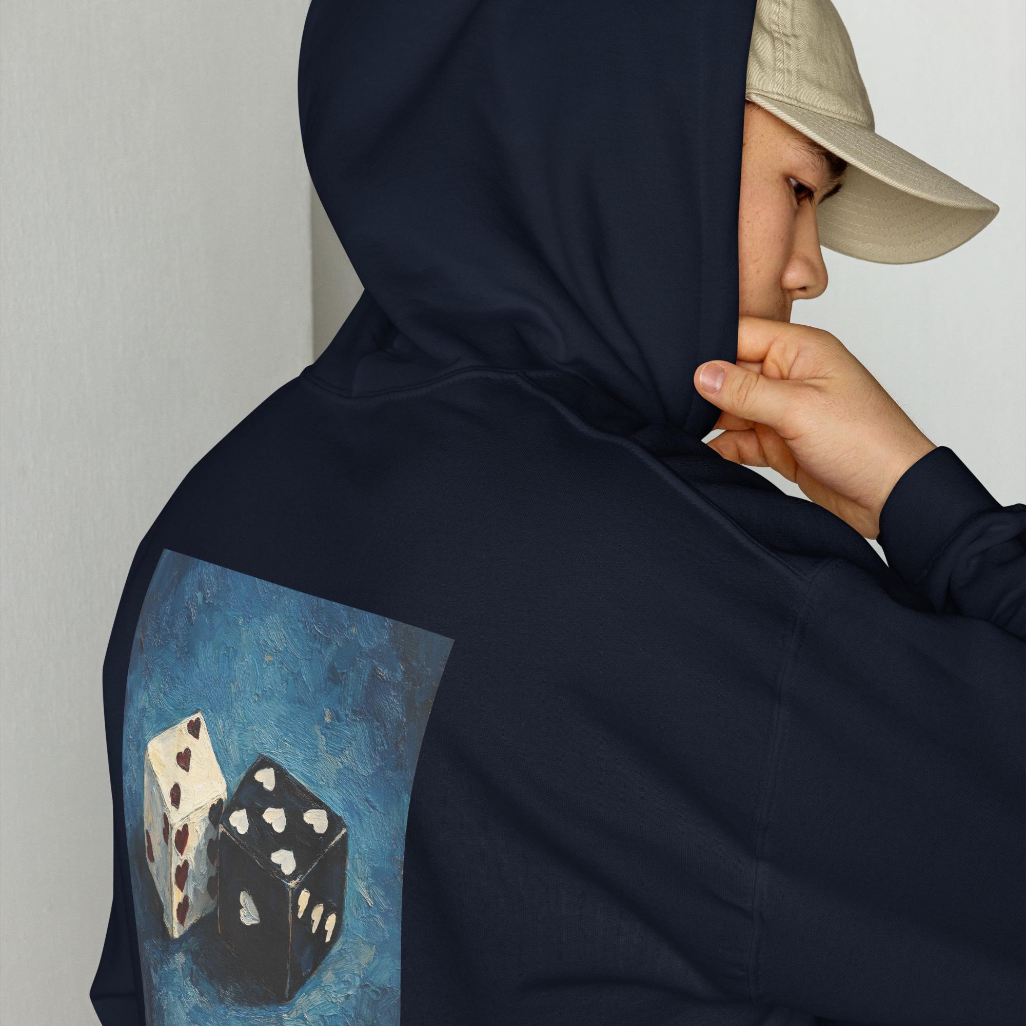 This artistic dice hoodie represents risk, luck, and decision-making, featuring heart-shaped details that add emotion to chance. The textured, painterly style gives the design depth and character while maintaining a timeless artistic vibe.