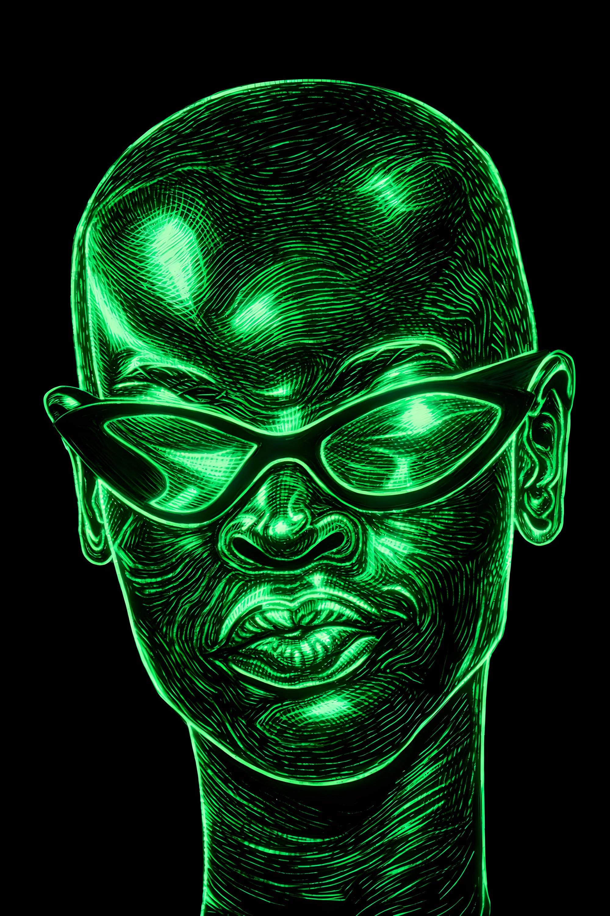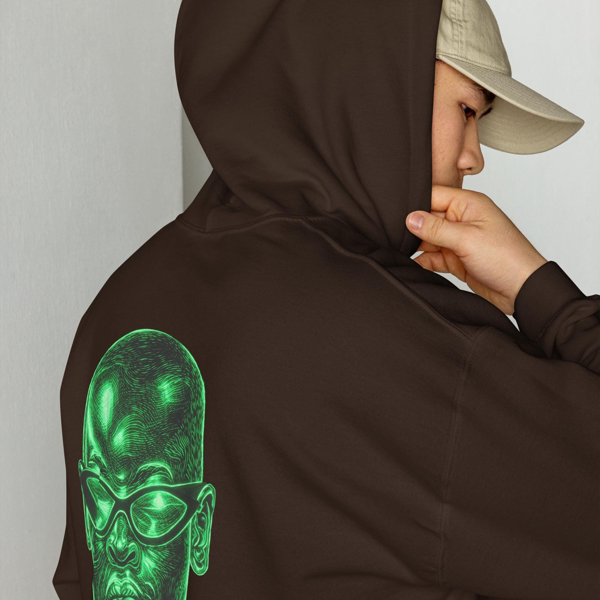 This hoodie showcases a striking neon green line-art portrait with futuristic and cyberpunk vibes. The glowing effect and detailed texture make it perfect for rave culture, night aesthetics, and bold streetwear lovers.