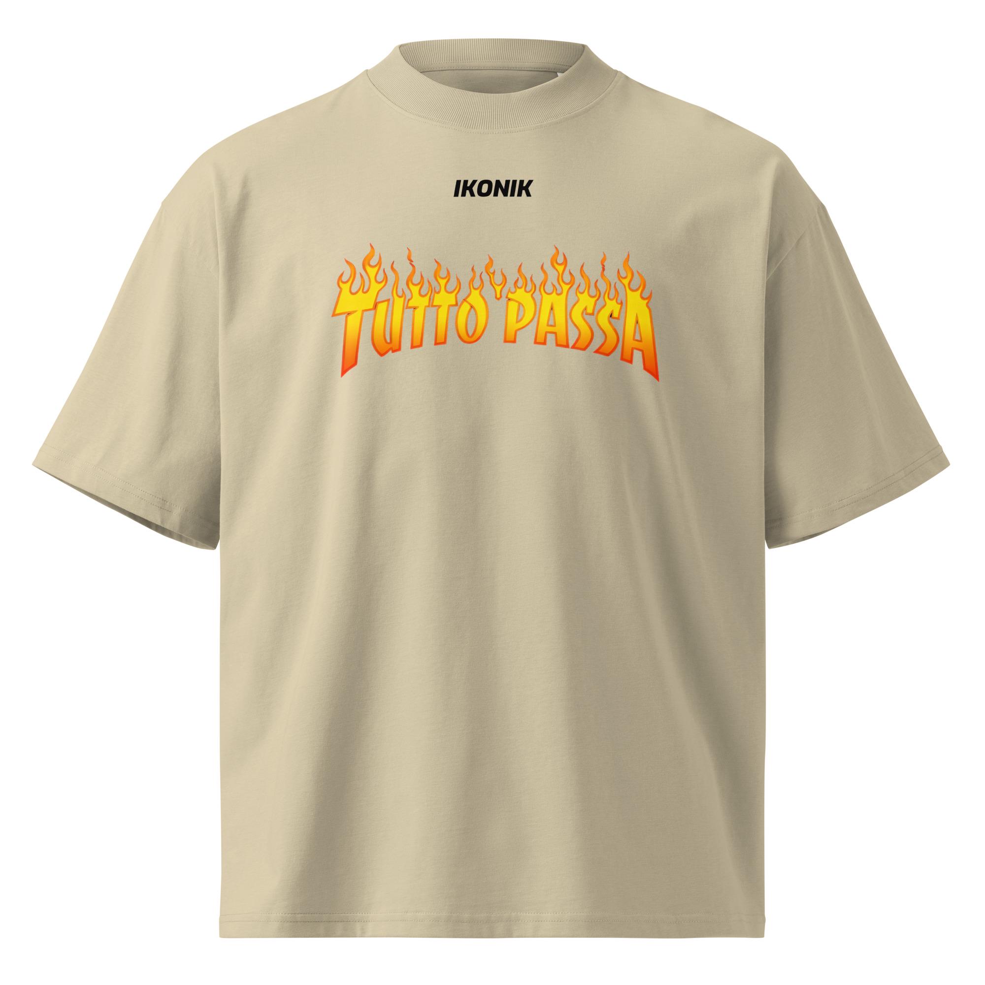 Make a bold yet meaningful statement with this oversized t-shirt featuring the phrase “Tutto Passa” in striking flame typography. Inspired by the idea that everything is temporary, this design blends streetwear attitude with a timeless message. Crafted from premium organic cotton, it offers a relaxed oversized fit with dropped shoulders and a wide collar—perfect for everyday wear, layering, or elevating a casual look with purpose and style.