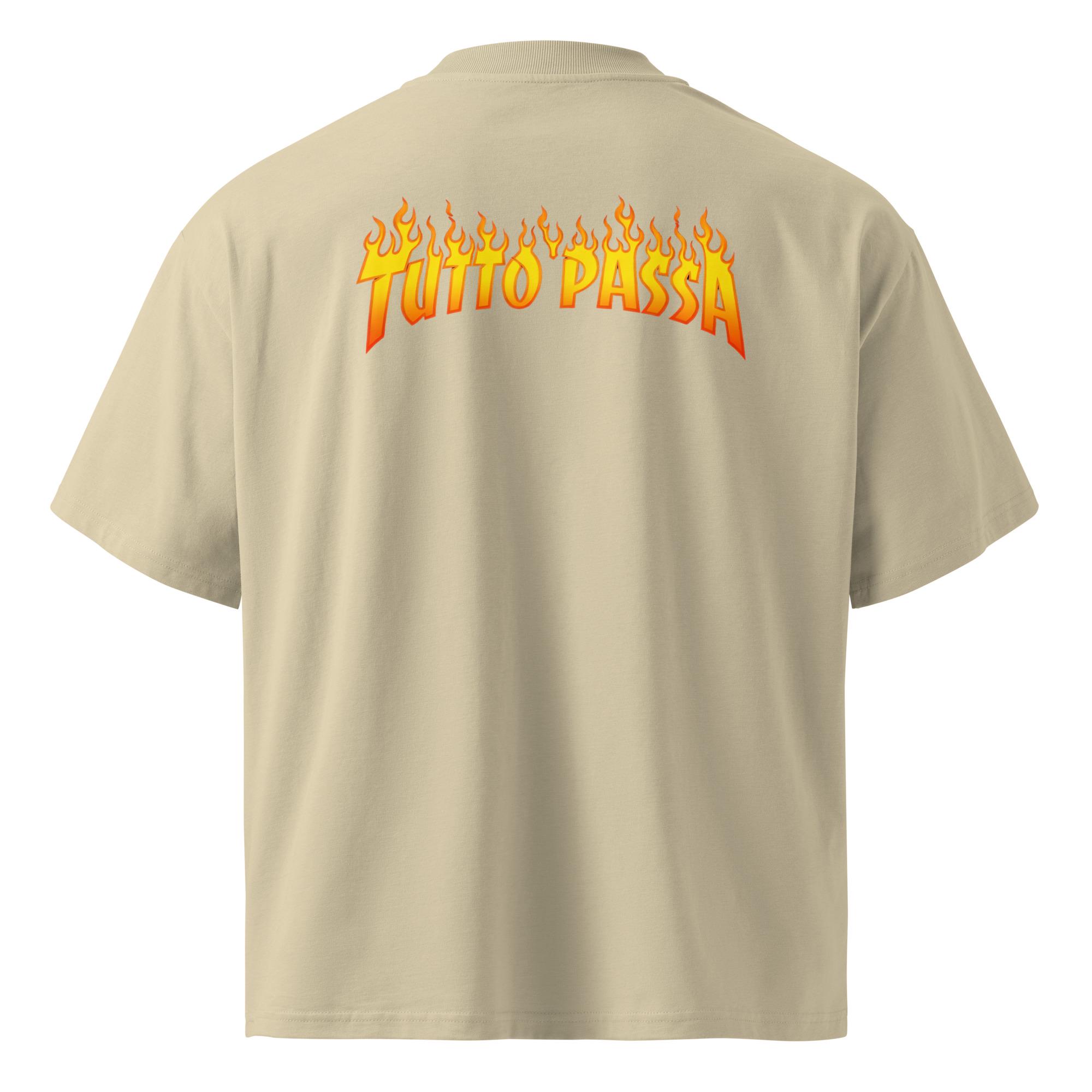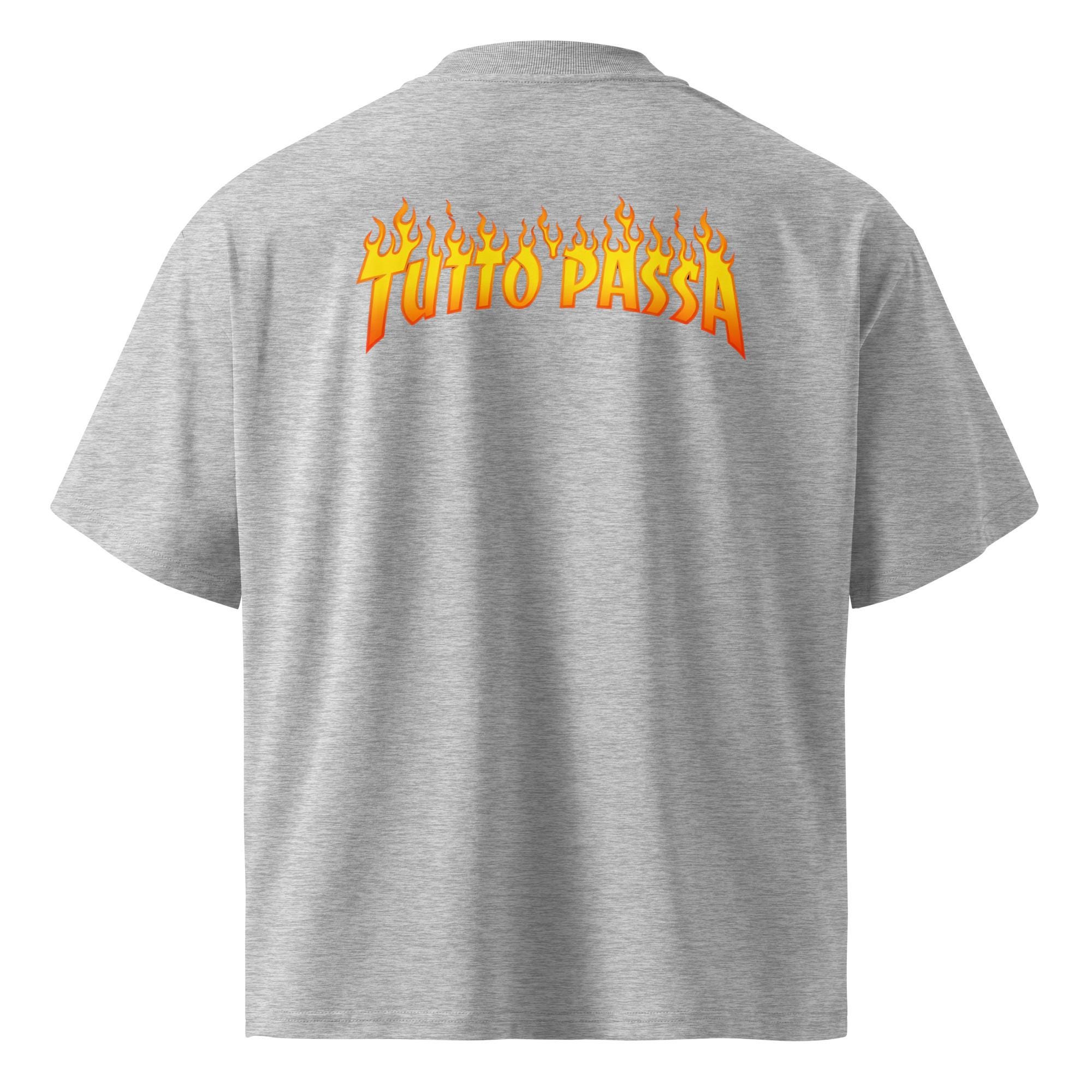 Description Make a bold yet meaningful statement with this oversized t-shirt featuring the phrase “Tutto Passa” in striking flame typography. Inspired by the idea that everything is temporary, this design blends streetwear attitude with a timeless message. Crafted from premium organic cotton, it offers a relaxed oversized fit with dropped shoulders and a wide collar—perfect for everyday wear, layering, or elevating a casual look with purpose and style.