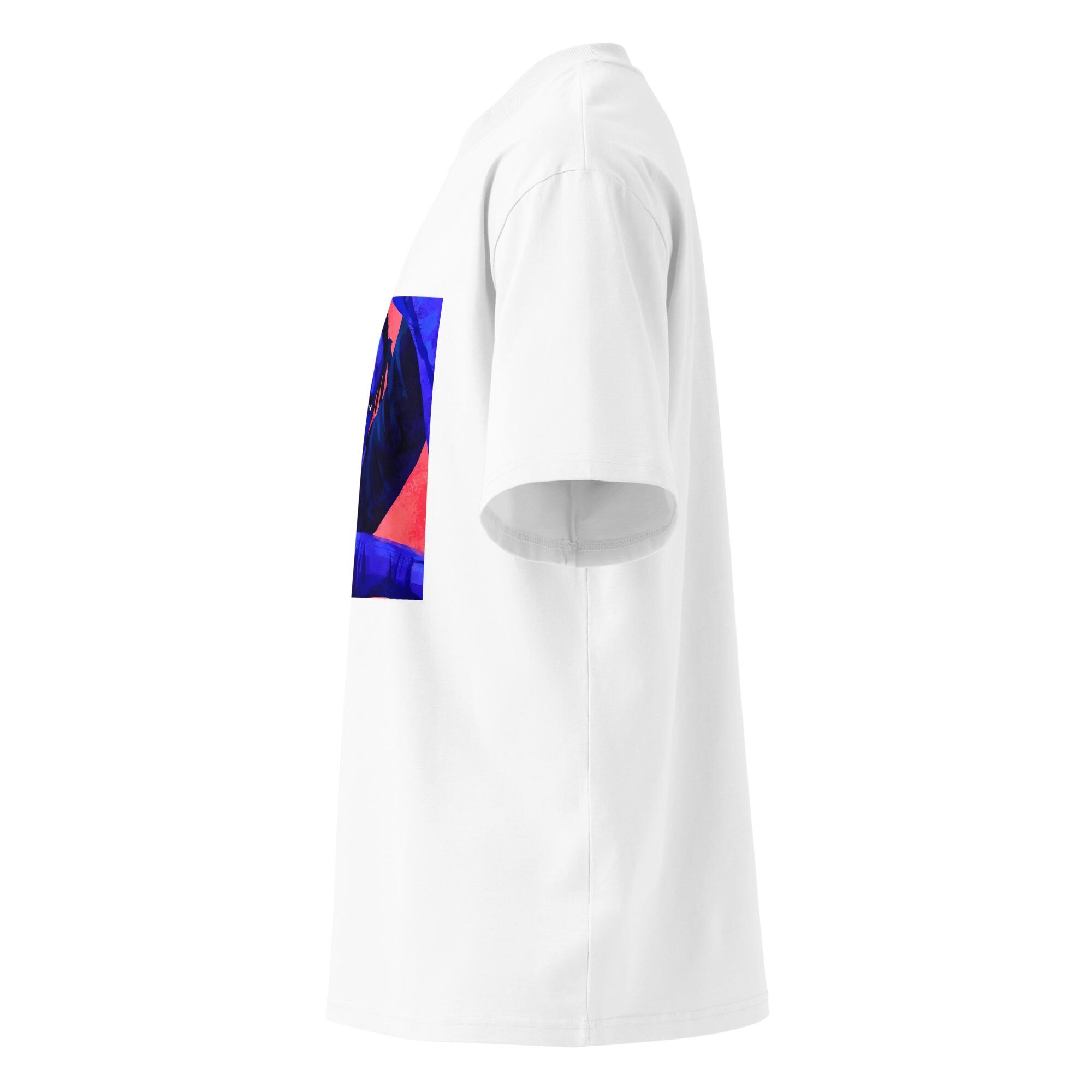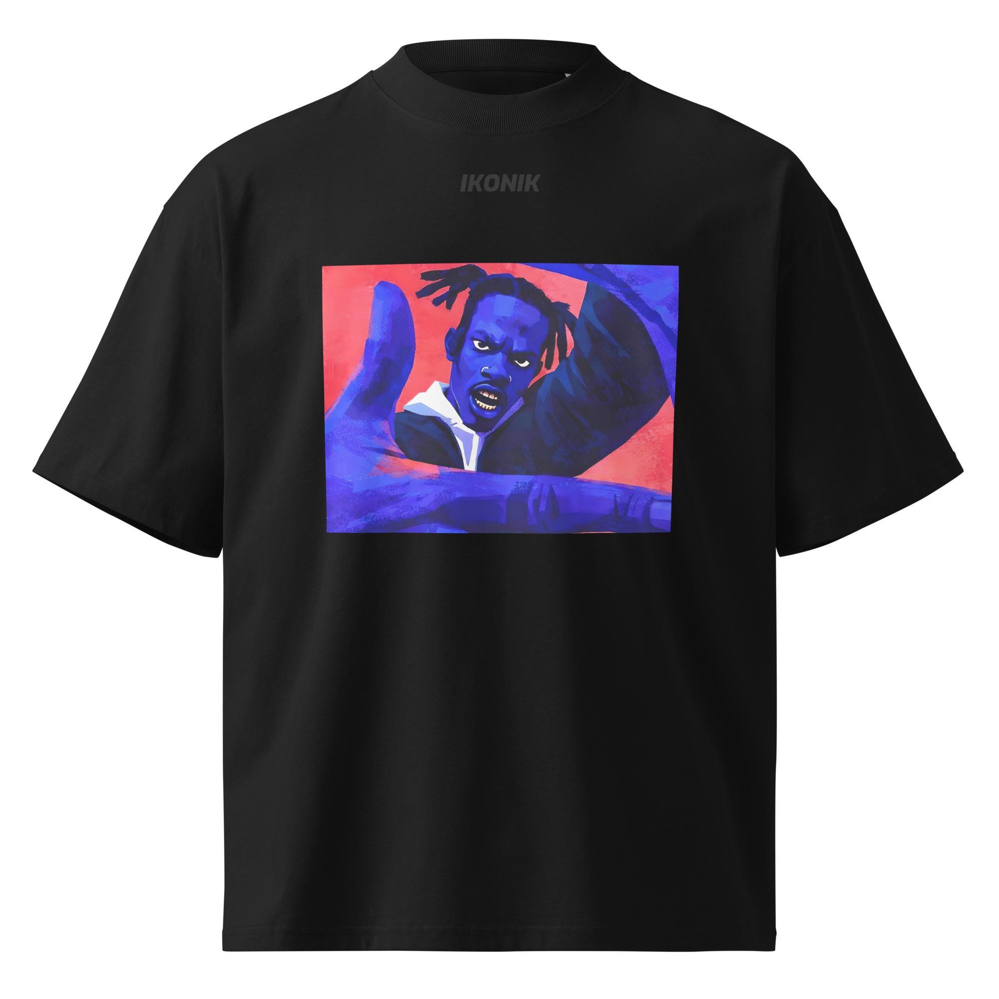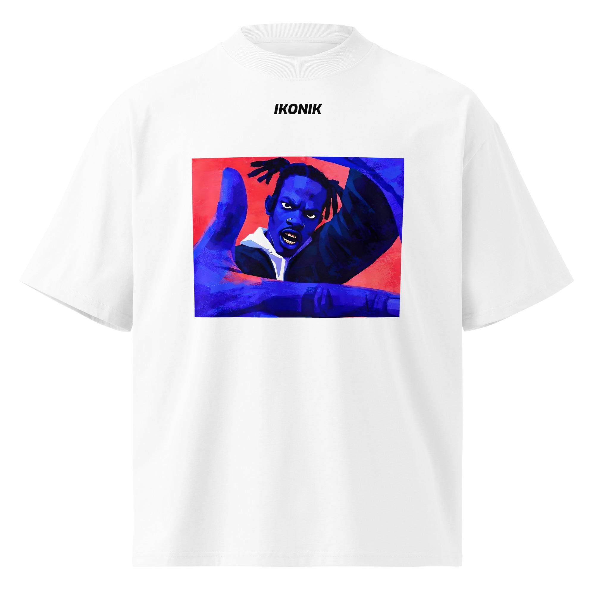 This IKONIK abstract graphic t-shirt features a bold, high-energy illustrated portrait with intense expression and striking blue tones.