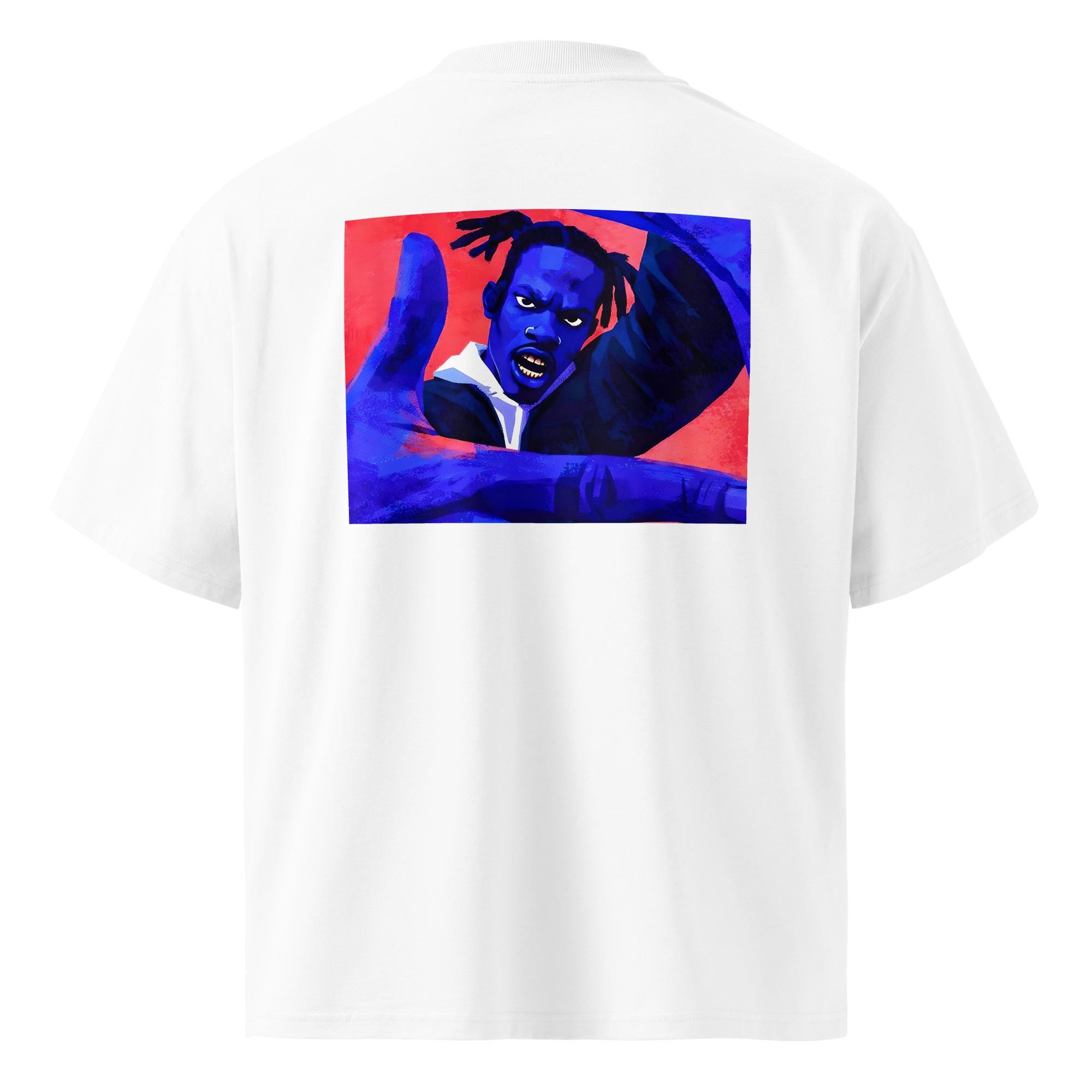 This IKONIK abstract graphic t-shirt features a bold, high-energy illustrated portrait with intense expression and striking blue tones.